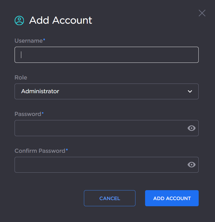 To reset the password of an existing account, type the new password in the Password field and again in the Confirmation Password field. For the allowed characters, see "Password Requirements" in Changing Your Password.