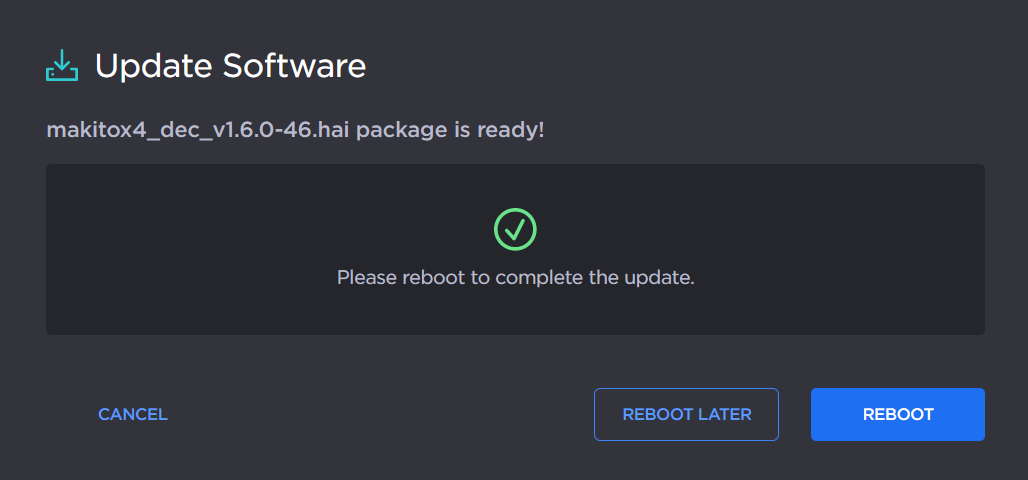 If you select Reboot Later, the chosen package will be installed upon the next reboot.