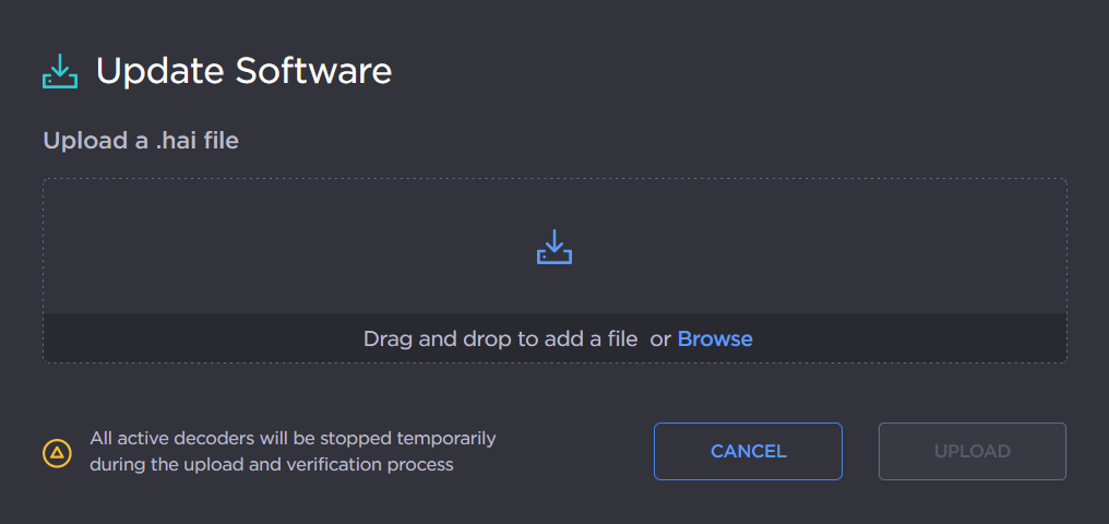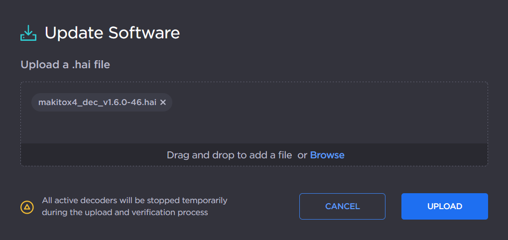 The firmware upgrade comes in the form of a file with the extension .hai, which when loaded will replace the application on your Makito X Series appliance. The firmware upgrade components are digitally signed, and these signatures are all verified before performing the installation.
