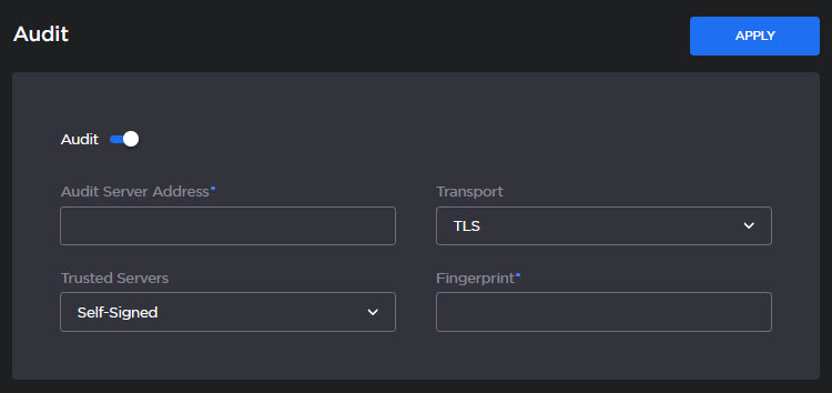 If Trusted Servers is set to Self-signed, copy the Fingerprint string from the Audit server's certificate and paste it in the Fingerprint field under Audit Settings to identify the certificate trusted for this TLS connection. The fingerprint should be that of the certificate that belongs to the audit server which was set in "Audit Server Address".