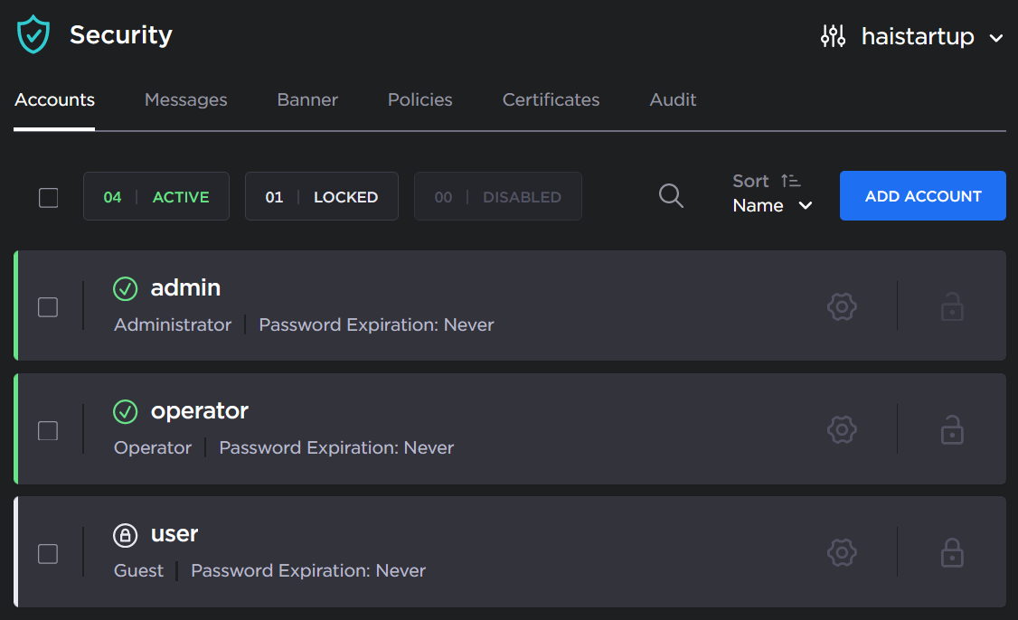 .If Disable Inactive Accounts has been turned on (see Managing Security Policies), certain accounts may be disabled. To re-enable an account, check the checkbox next to the account name, and click the Enable button.