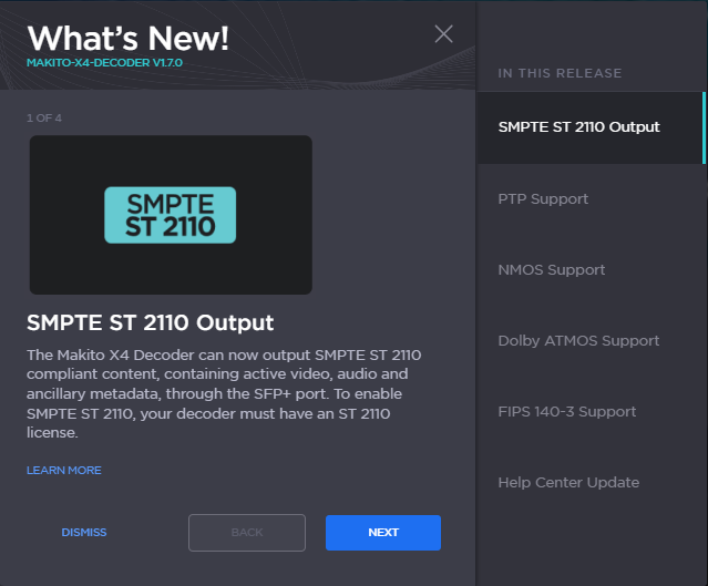 Upon signing in after an upgrade, a What's New panel will appear. This panel describes the new capabilities in your Makito X4 Decoder version, as in the example below.