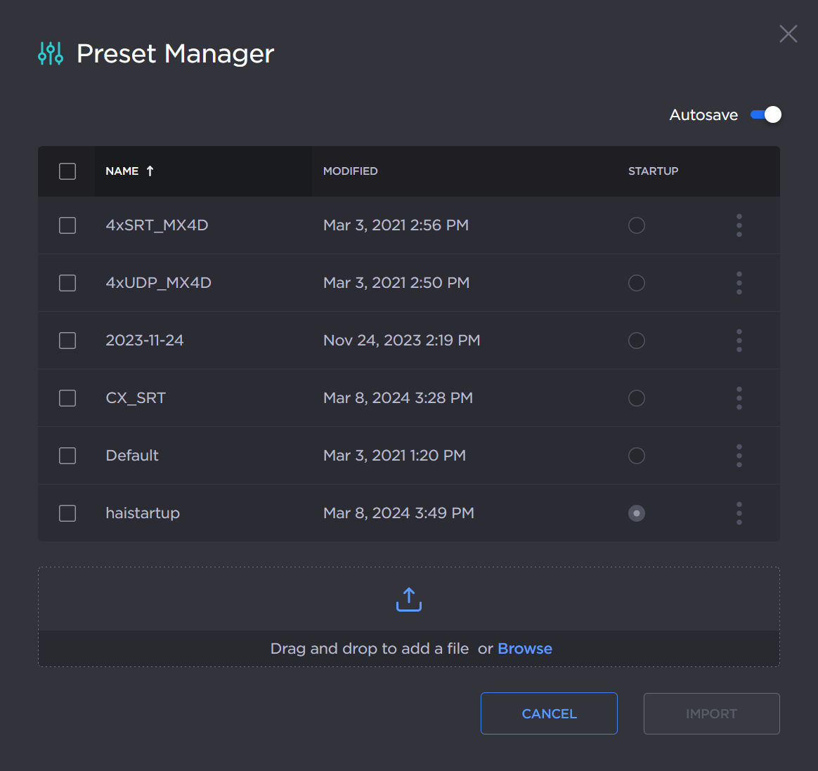To enable or disable the preset Autosave, toggle Autosave on or off.