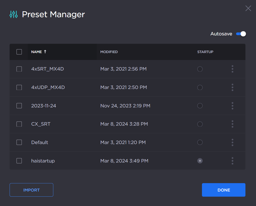 If Autosave is enabled, this preset will be set as the startup configuration automatically. If Autosave is disabled, you can select it as the startup configuration by checking the Set as Startup checkbox.