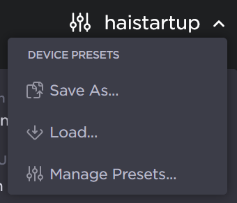If the preset Autosave function has been disabled, an amber warning indication will appear next to the Device Presets dropdown (in the header) on systems with unsaved configurations.