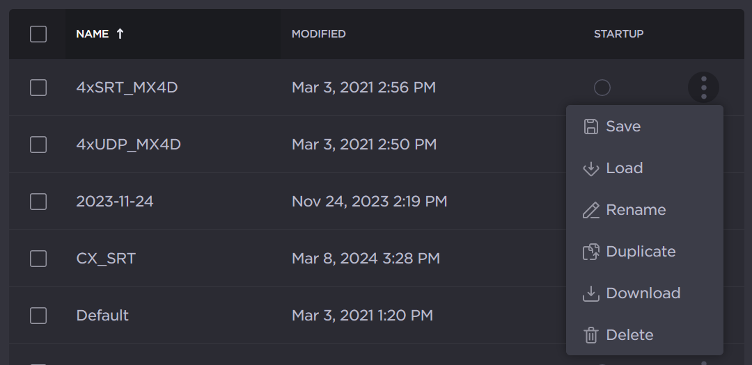 To load an existing preset into the current session, click the vertical ellipsis menu in the preset row and click Load.