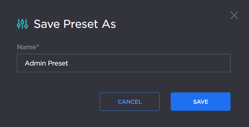 The Save Preset As panel opens. Type in a unique name for the preset in Name field and click Save.