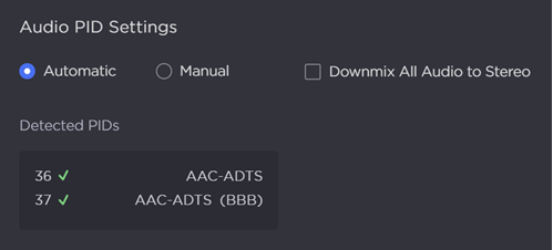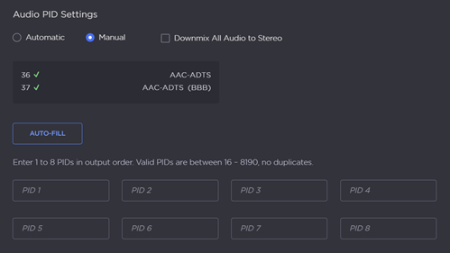 Audio PID | Automatic | (Optional) Set the Audio Packet Identifier to Automatic or Manual.