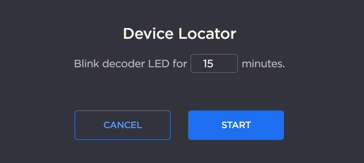 To initiate blinking of the Status and TX LEDs, click Locate. On the Device Locator dialog, adjust the time allowed to blink the decoder LEDs and click Start.