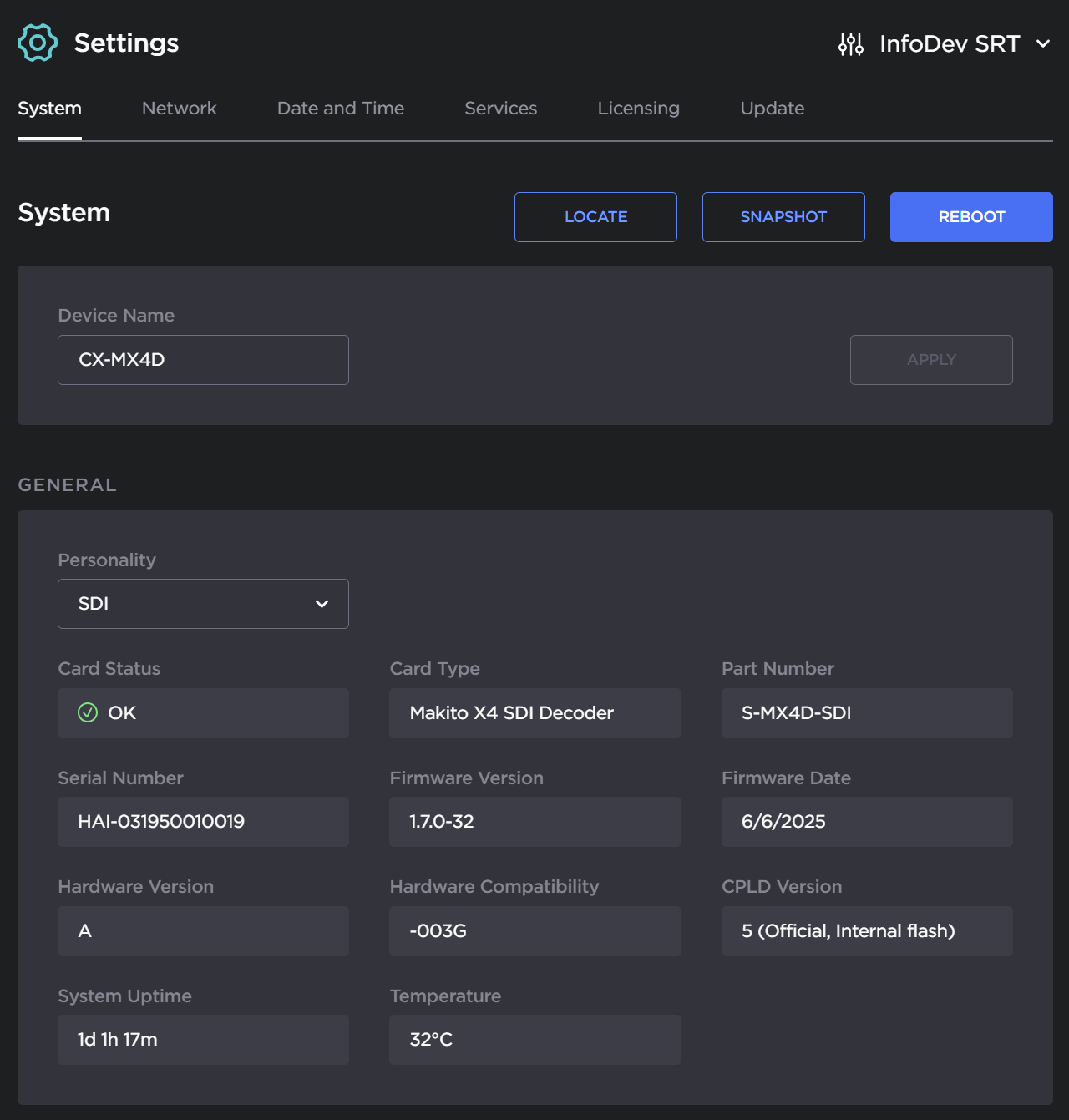 From the System page, you can view system status information about the Makito X4 decoder, such as the operating system uptime, along with information about the hardware and software components.