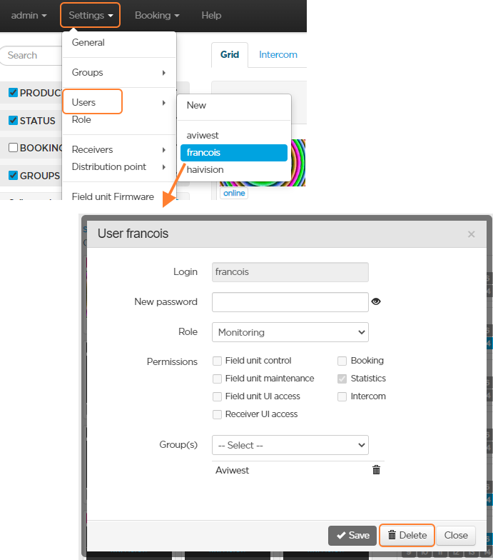 The user account is deleted. If a user was logged in to the Manager web interface with the deleted user account, he is automatically logged out.