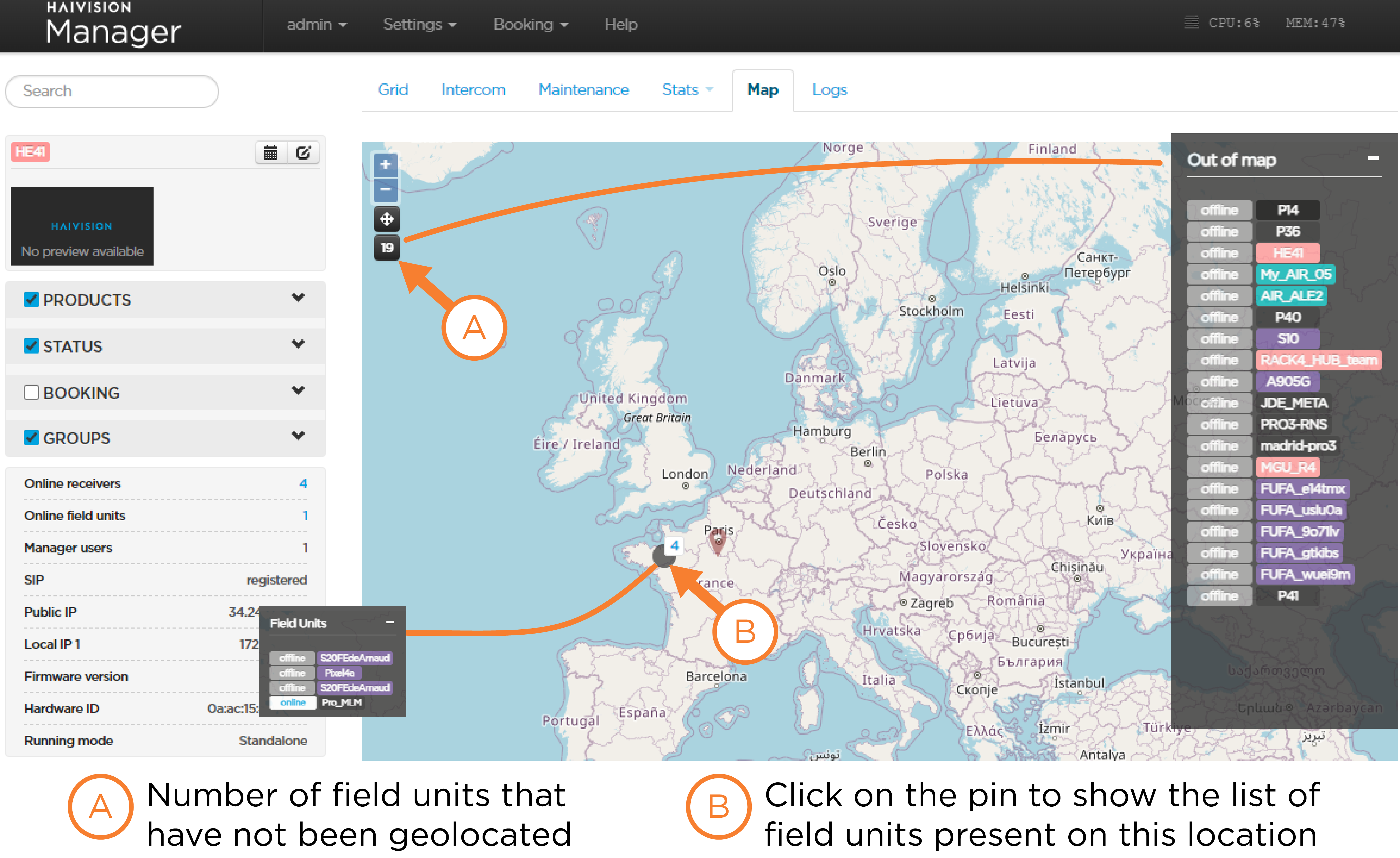 If several field units are very close, one pin indicates the number of field units.