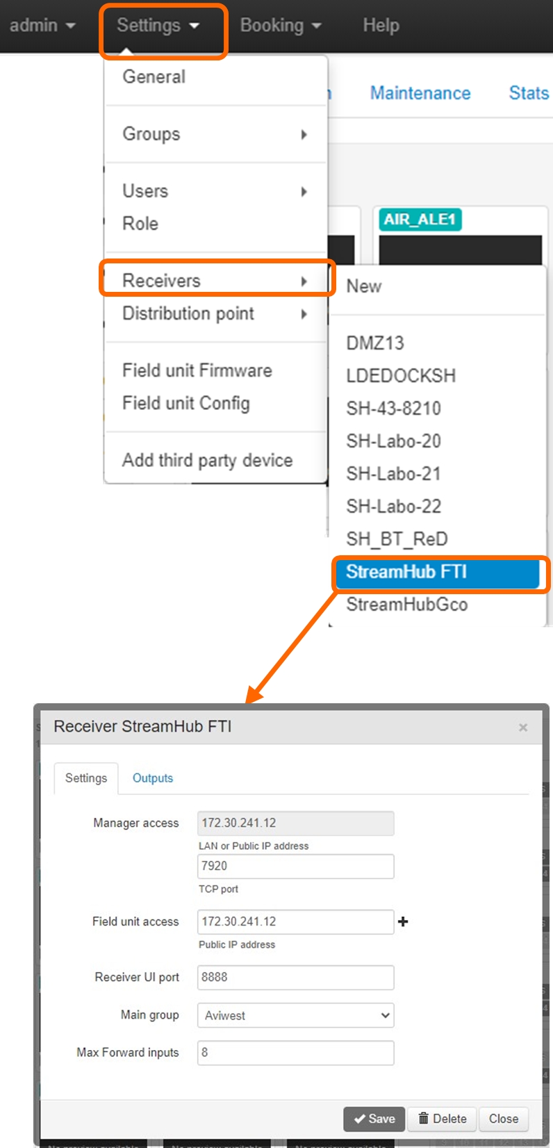 You cannot modify the IP address used for connecting the Manager to the receiver. If you need to modify this setting, you have first to delete the receiver, and then add it again with the new IP address.