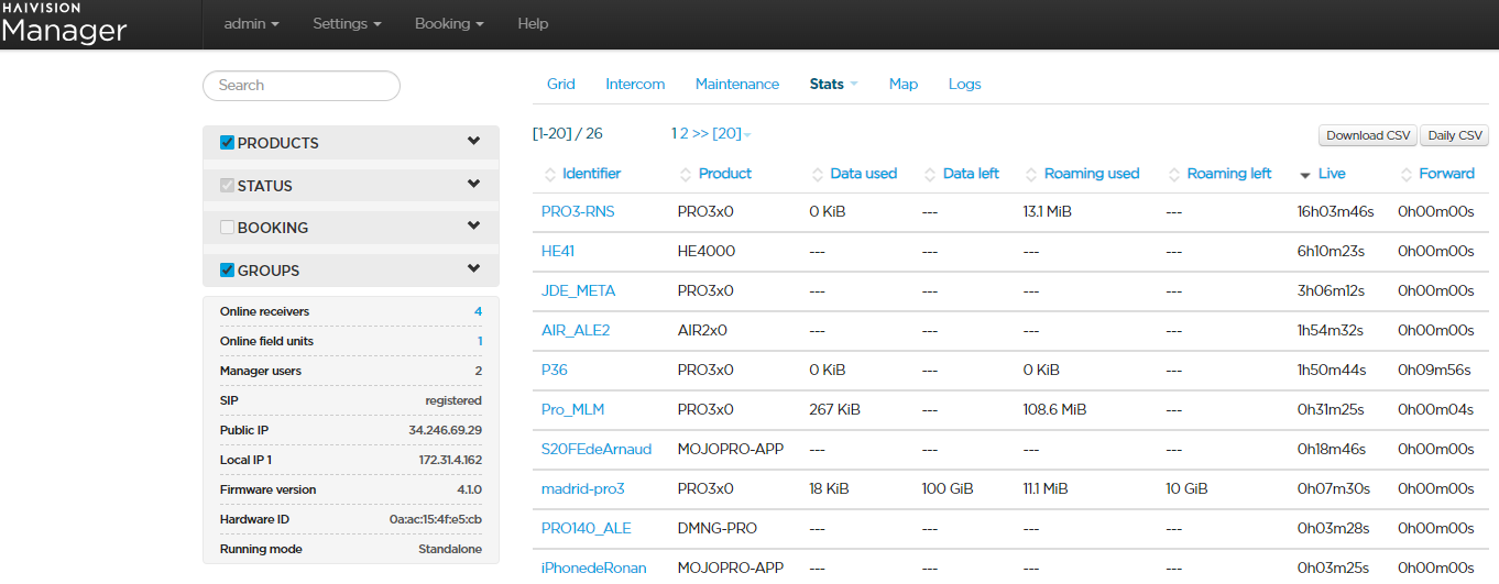 For each field unit, you can see the cumulative duration for each type of transmission, Live and Forward.