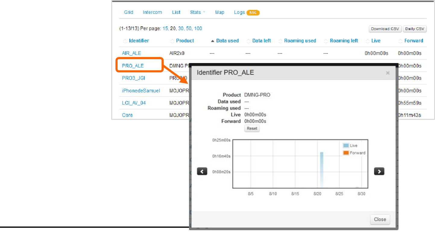However, the daily durations are kept in the daily csv file and on the diagram. To reset the cellular data usage on the SIM cards inserted into a field unit, see Resetting the Cellular Data Usage.
