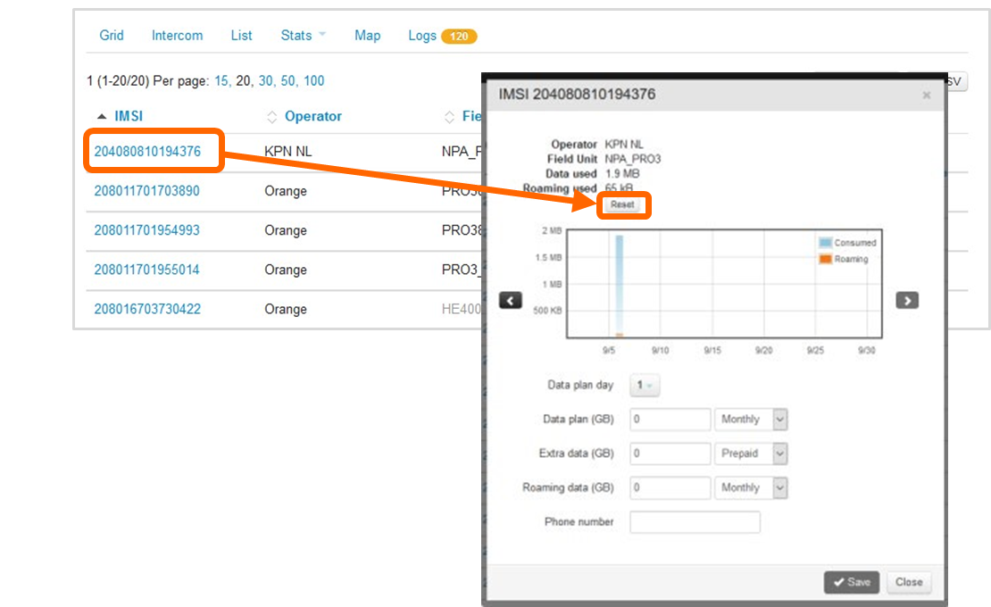 If the license applied on the Manager software enables the statistics, the administrator and the users with the "Statistics" permission can manually reset the data usage on a SIM card.