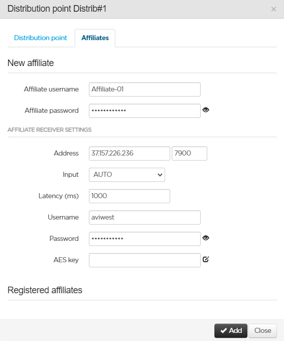 Click Add to confirm. Each affiliate that is added appears under the Registered affiliates section.