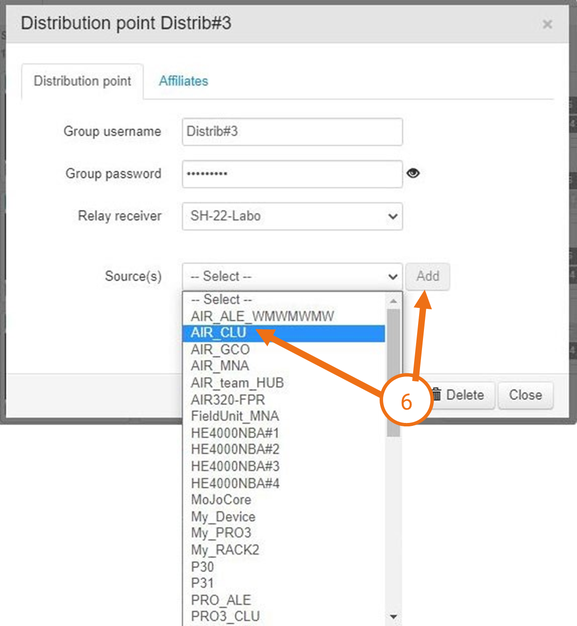 Under the Affiliates tab, define each affiliate and its associated receiver input settings to be able to receive the video stream from the receiver relay: