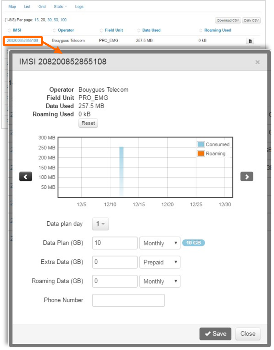 The amount of data usage is refreshed only when field units are connected to the Manager. This means that in case of SIM consumption reset according to dataplan, the field unit (including this SIM) amount will be refreshed on next connection to the Manager.