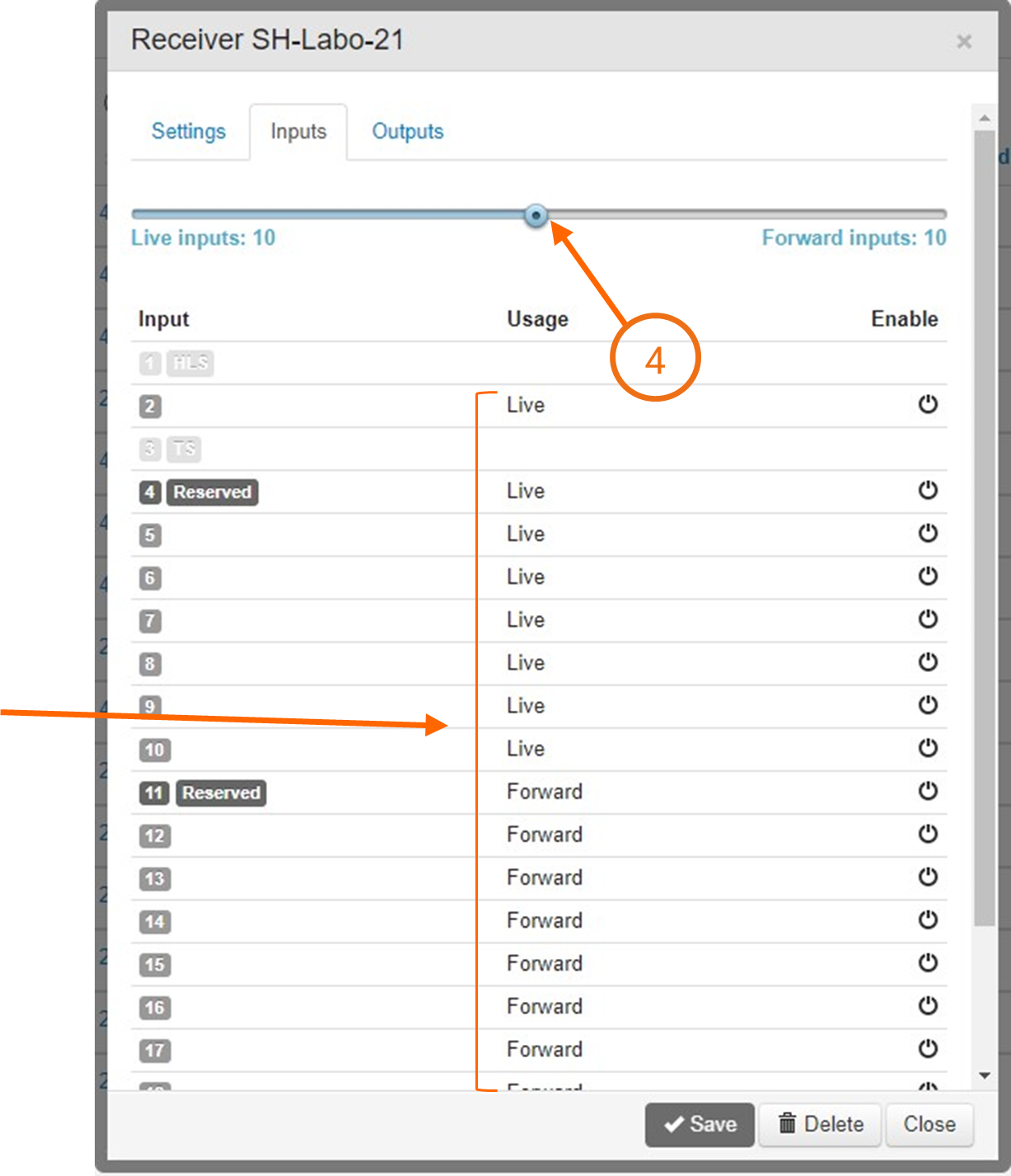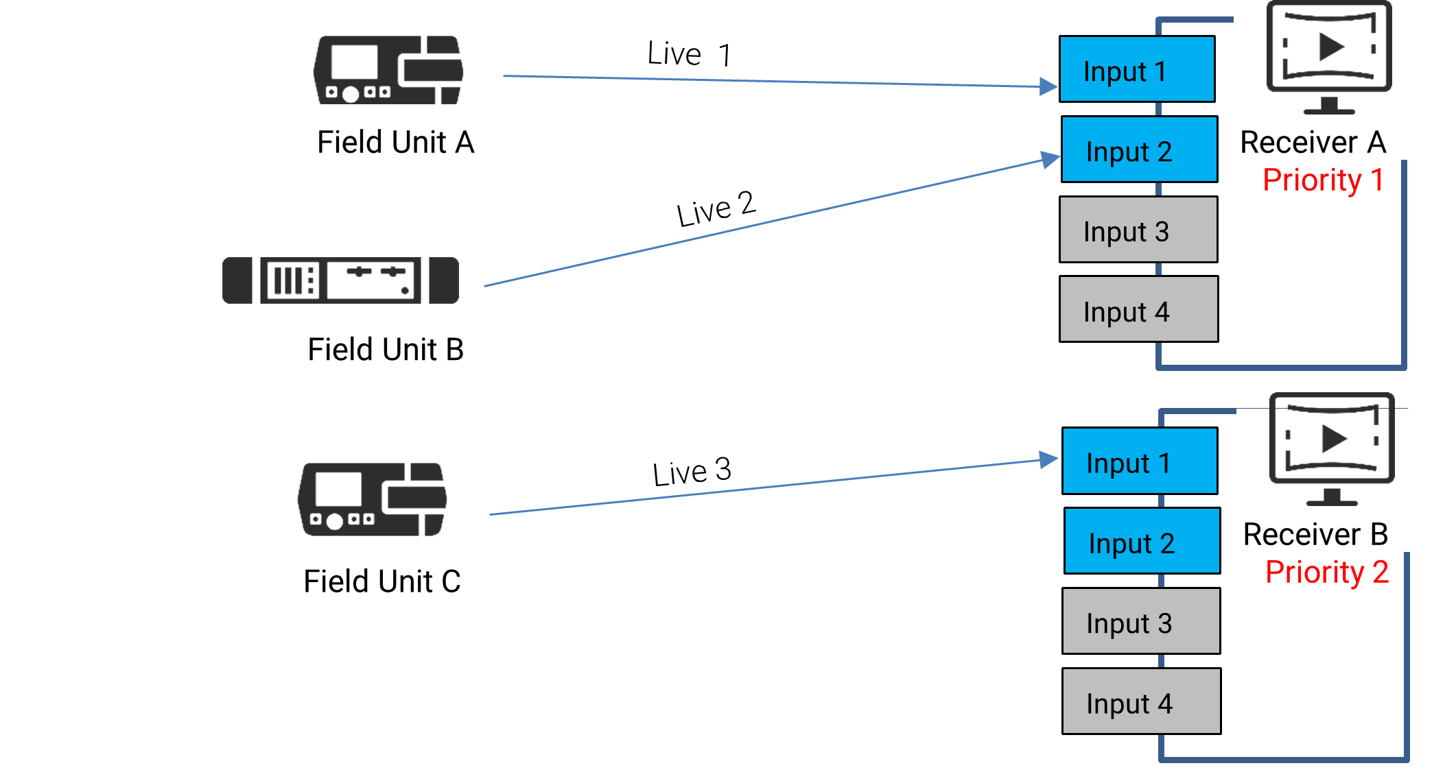 When starting a Live, the first dedicated input on the highest priority receiver is used, if available. If not, the next input is used. When all dedicated inputs are used on the priority receiver, the Live is directed towards the dedicated inputs of the next priority receiver.