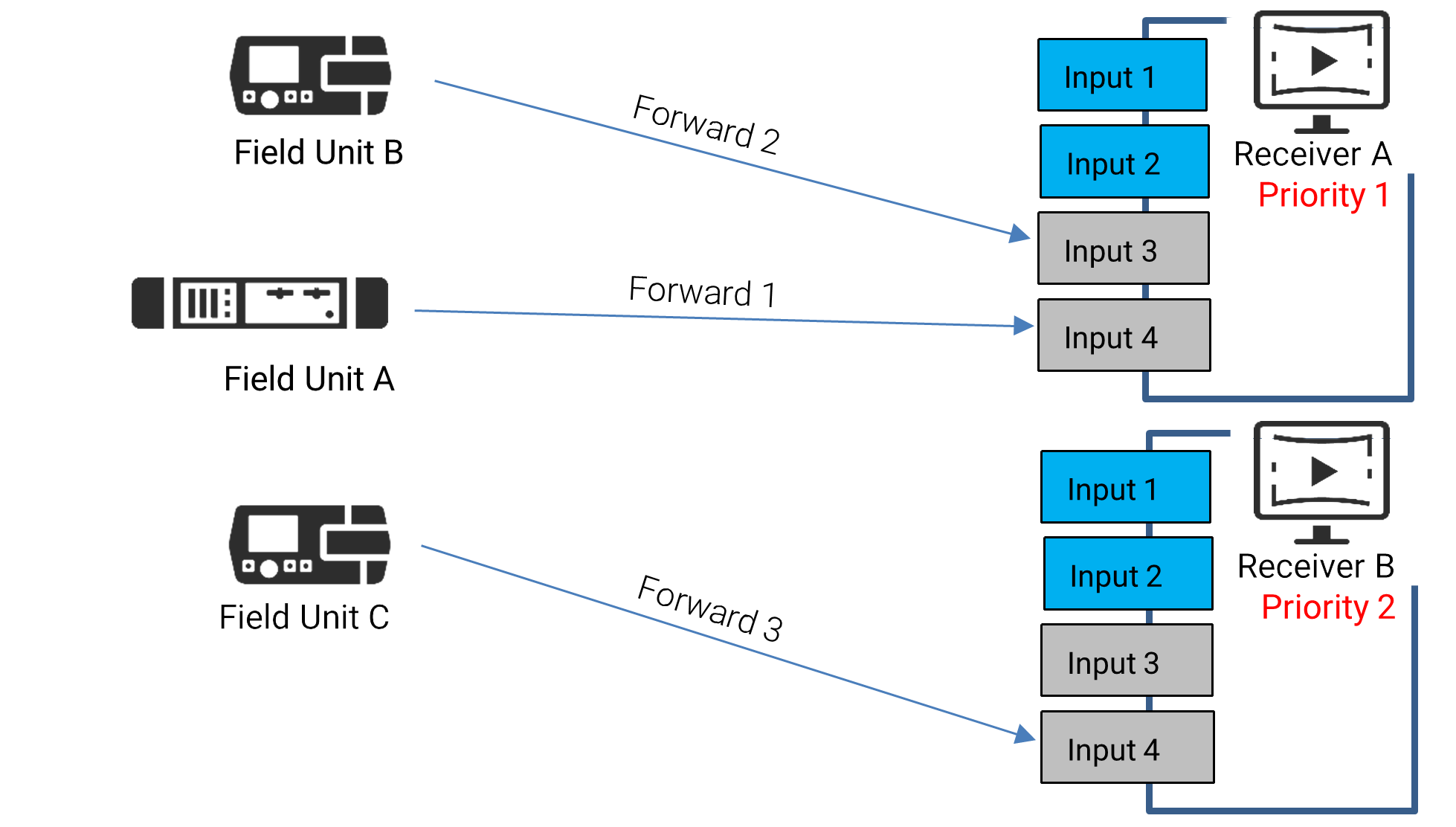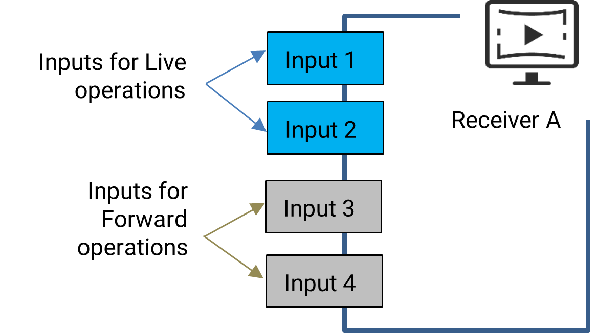 Unlike the inputs dedicated to Live operations, the first input dedicated to Forward is the last receiver's input (see diagram below).