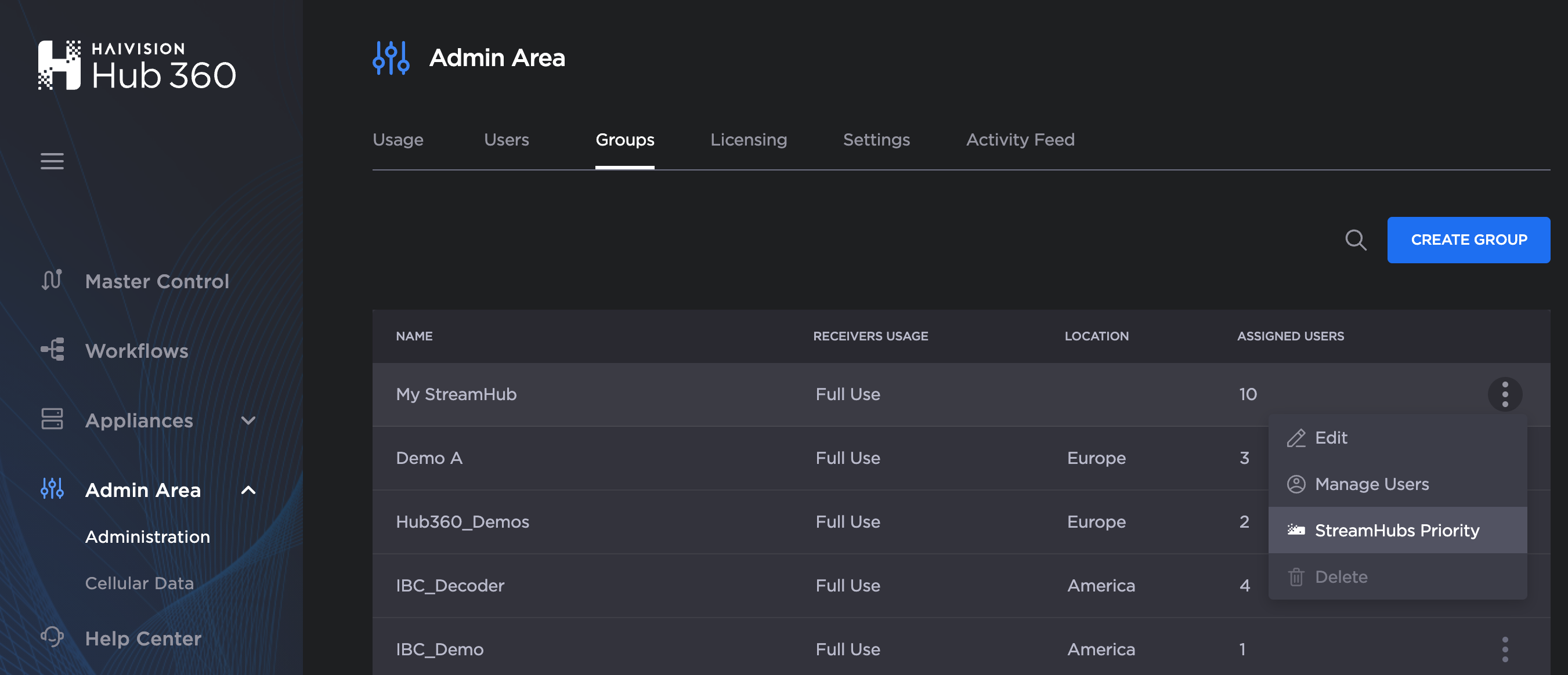 When a field unit is establishing a connection on Hub 360, and a Live is started, the expected behavior is to automatically route the incoming Live to the first available output of the server setup in priority. This priority can be changed in Admin Area under Administration > Groups by editing StreamHub Priority