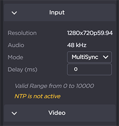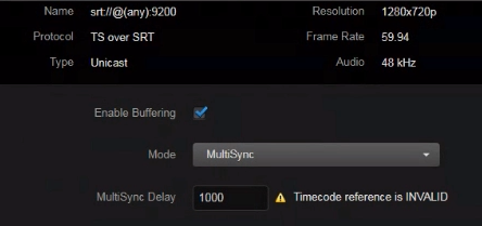 Once a decoder starts receiving a stream, it gathers and computes various statistics. It then displays a range of possible MultiSync Delay ranges (e.g., “Min = 120 ms, Max = 2,032 ms” on the Makito X).