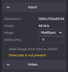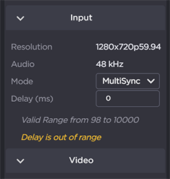 A yellow triangle appears next to the MultiSync Delay field if the value is outside the acceptable range. Position the cursor over the triangle to see a tool tip explaining the problem, as shown in the following example.