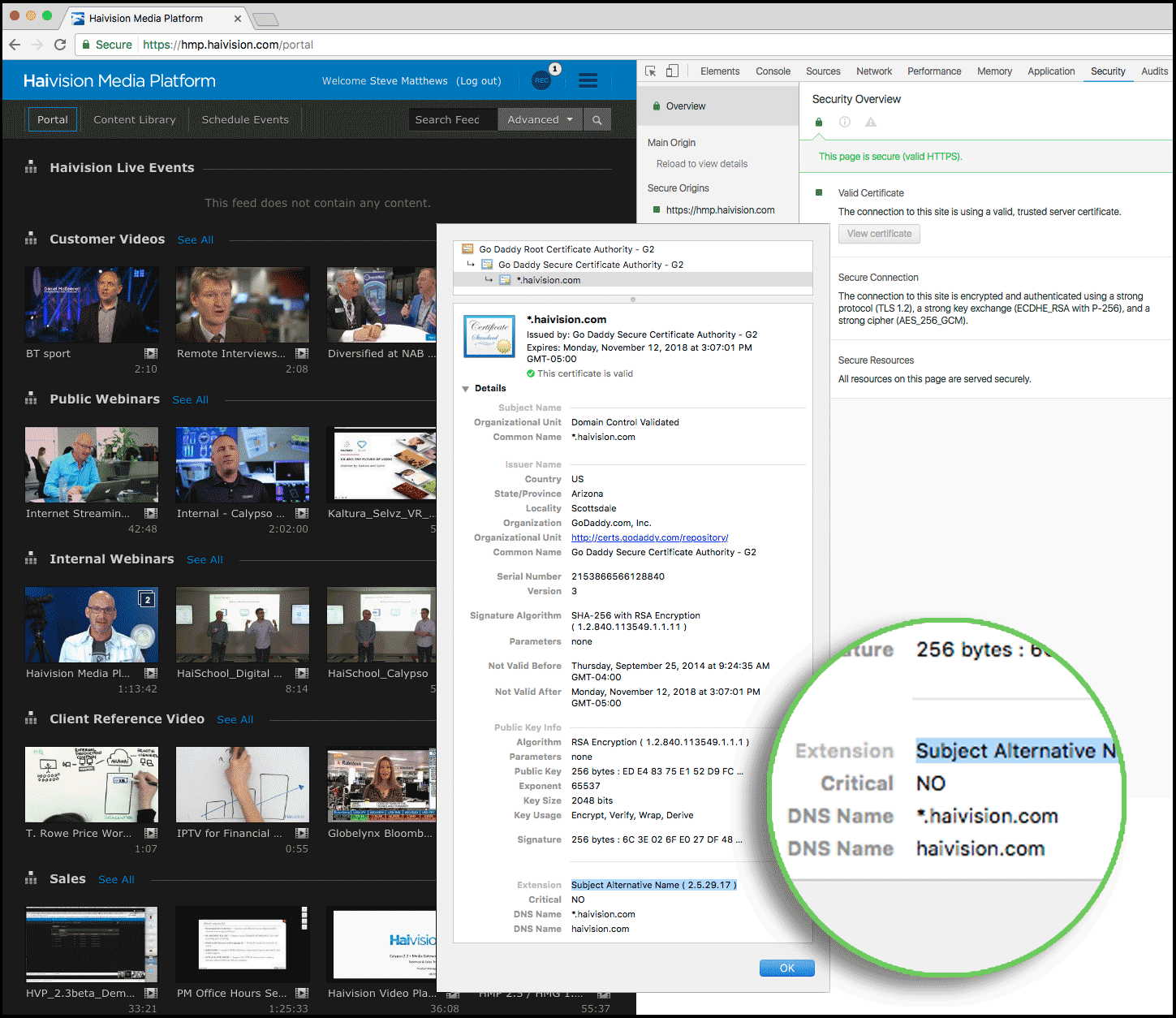 The screenshot below shows details of the valid certificate for a Haivision Media Platform server. Notice that the SSL v3 Extension for Subject Alternative Name is populated with valid DNS Names. This is how to prevent exposing users to the "Common Name Invalid" error.