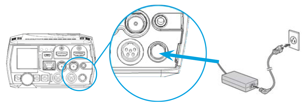 Connect the AC/DC adapter to the front of the unit and connect it to the power supply.