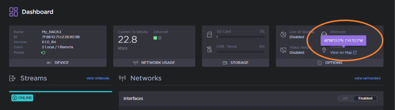 When the option is enabled, you can check the location information of the device either from the Unit Panel or from the Web Interface.